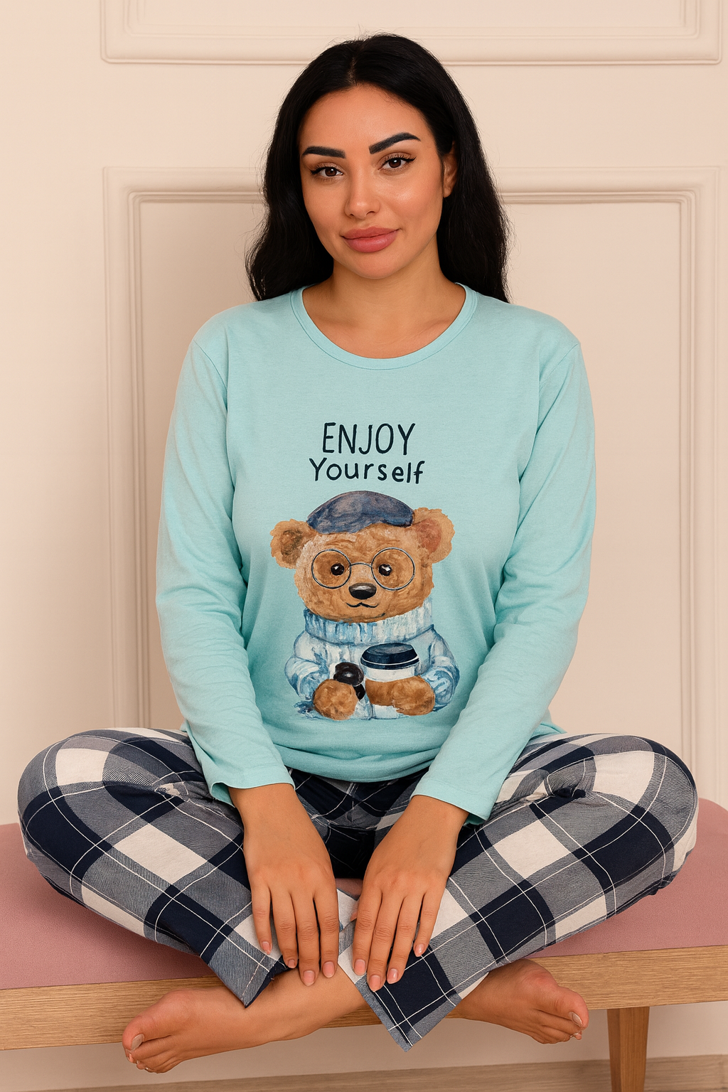 Niketlife Ev Giyim’in enerjik ve modern tasarımı Kadın Ayıcık Baskılı ve Altı Ekose Desenli Bisiklet Yaka Uzun Kol Altı Uzun Penye Pijama Takımı, yumuşak ve nefes alabilen Penye kumaş yapısıyla gün boyu rahatlık sunar. slogan detayı, bisiklet yaka ve uzun alt tasarımıyla birleşerek hem şık hem de rahat bir uyku ve ev giyimi deneyimi sağlar.