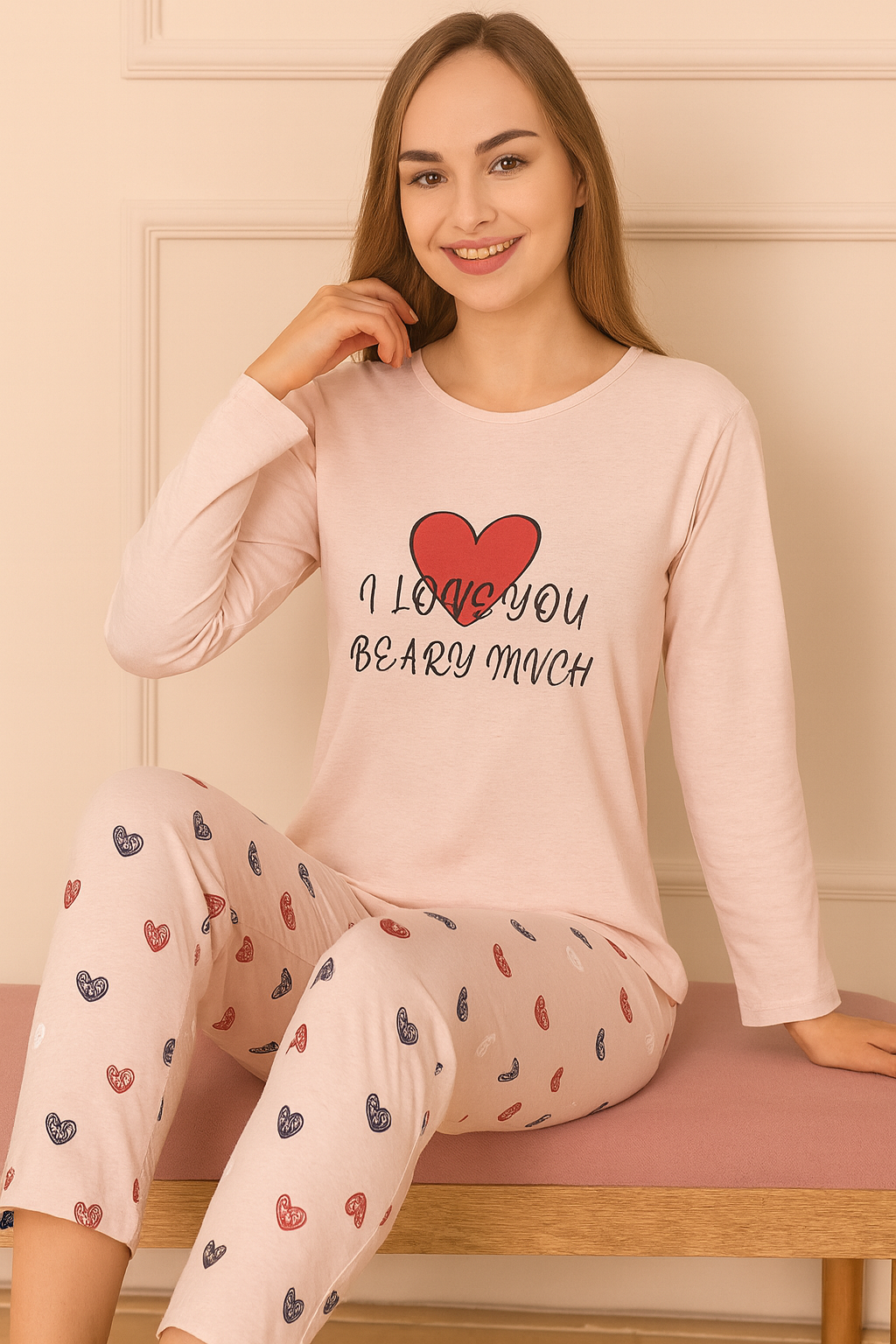Kadın Kalp Baskılı ve Sloganlı Bisiklet Yaka Uzun Kol Altı Uzun Penye Pijama Takımı