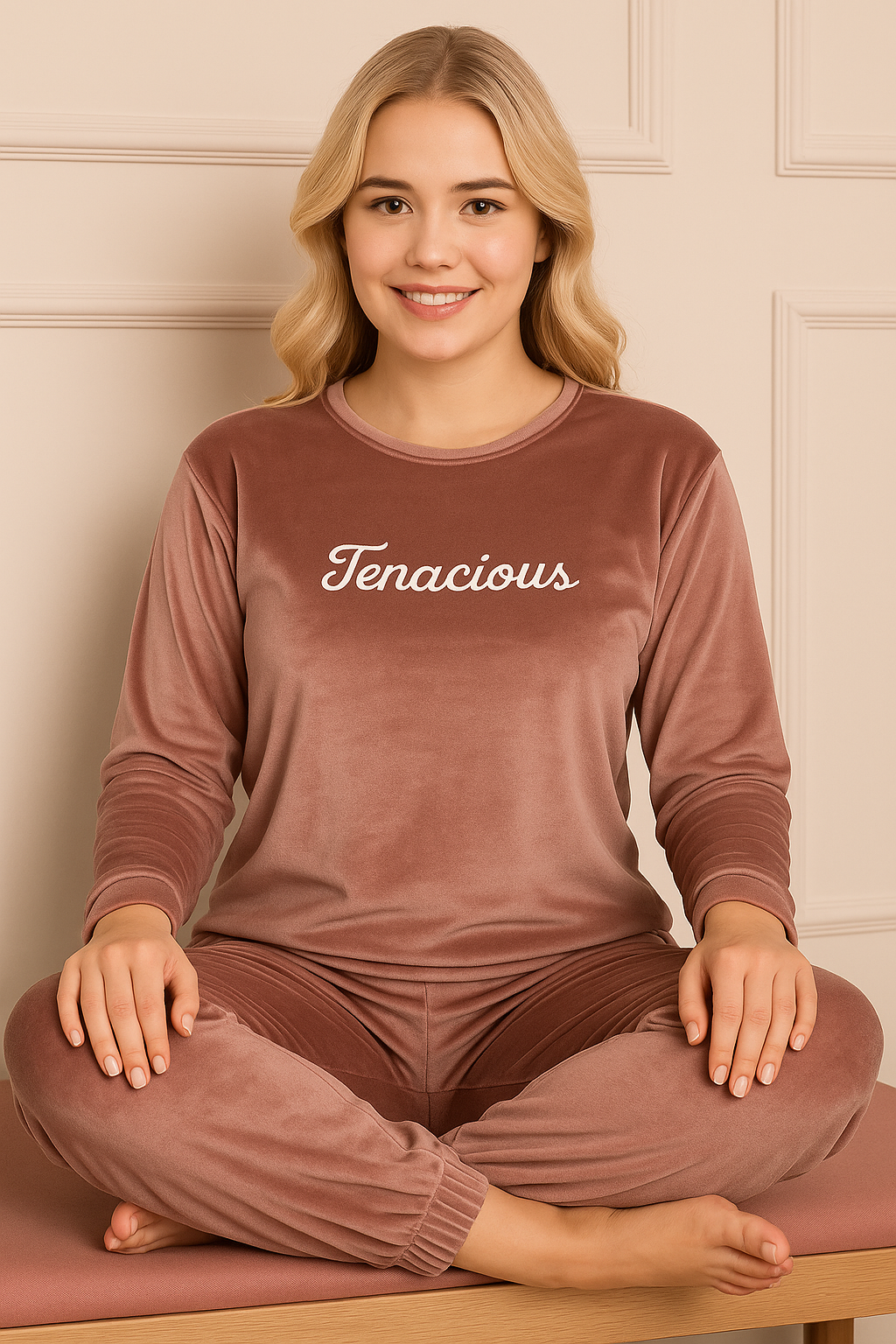 Kadın Sloganlı Uzun Kollu Paçası Manşetli Kadife Pijama Takımı (N.LIFE-92100-9)