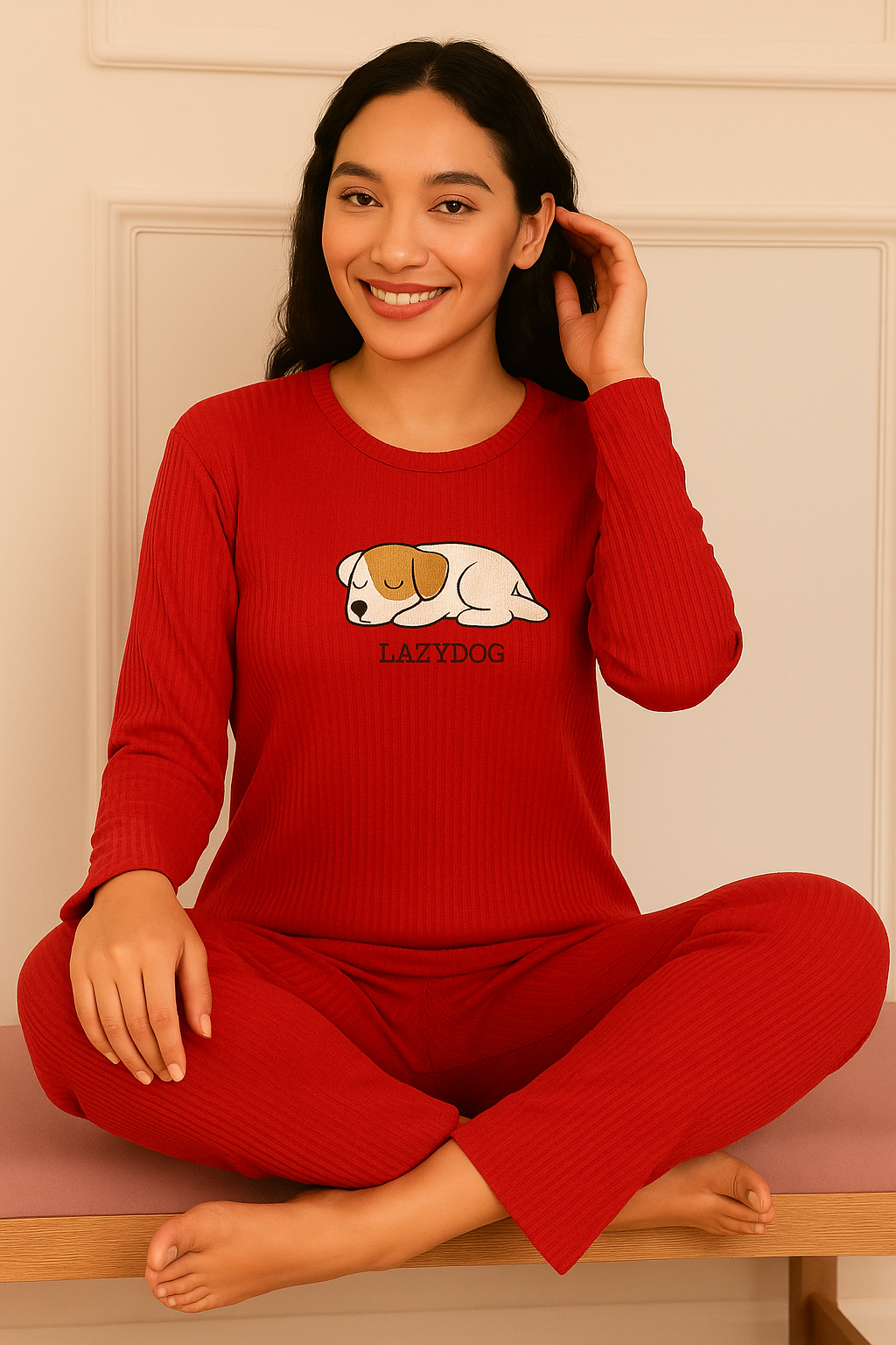 Niketlife Ev Giyim’in enerjik ve modern tasarımı Kadın Yavru Köpek İşlemeli ve Lazy dog Sloganlı Fitilli Bisiklet Yaka Uzun Kol Altı Uzun Pamuklu Pijama Takımı, yumuşak ve nefes alabilen pamuklu kumaş yapısıyla gün boyu rahatlık sunar. slogan detayı, bisiklet yaka ve uzun alt tasarımıyla birleşerek hem şık hem de rahat bir uyku ve ev giyimi deneyimi sağlar.