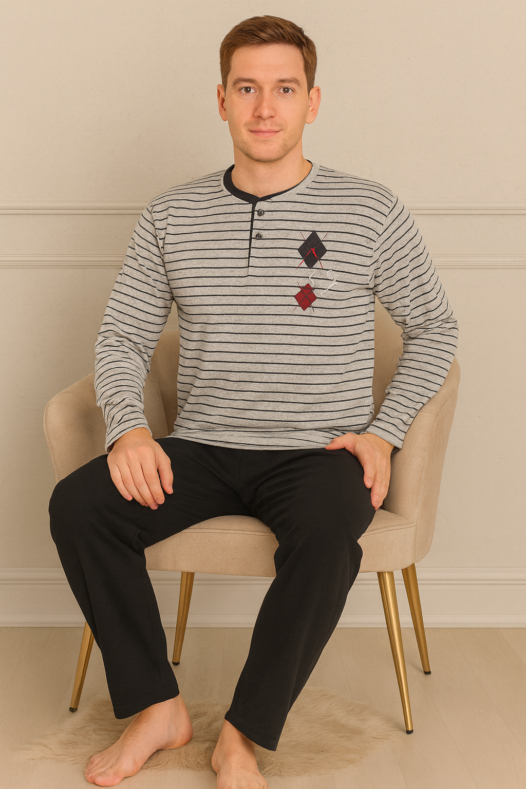 Erkek İnterlok Fitilli Uzun Kol Yakası İki Düğmeli Göğsü Nakış İşlemeli Altı Uzun Pijama Takımı (N.LIFE-2072)