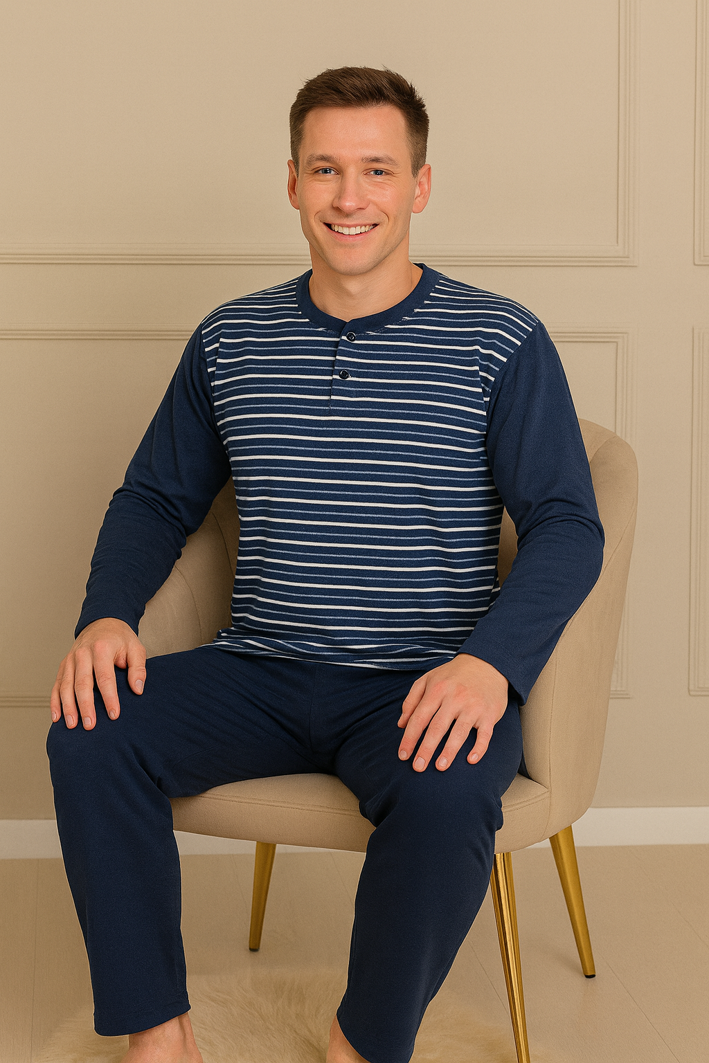 Erkek İnterlok Uzun Kol Yakası İki Düğmeli Yatay Çizgi Desenli Altı Uzun Pijama Takımı, şıklığı ve konforu bir arada sunar. Kalın dokulu interlok kumaşı sayesinde soğuk havalarda mükemmel sıcaklık sağlar. Üst bölümde yer alan iki düğmeli yaka tasarımı ve Yatay Çizgi detayı ile klasik ve modern çizgiyi birleştirir. Esnek yapısı sayesinde vücuda rahat uyum sağlar ve ciltte yumuşak bir his bırakır.