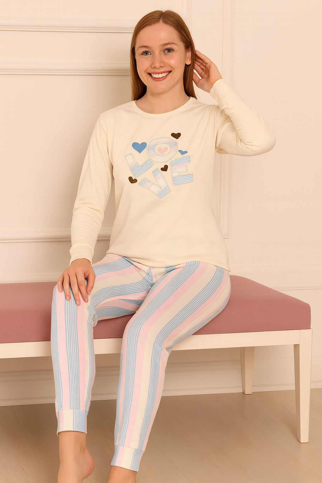 Kadın Love Sloganlı ve Kalp Desenli Altı kalın Çizgi Desenli Termal Pijama Takımı (N.LIFE-11501)