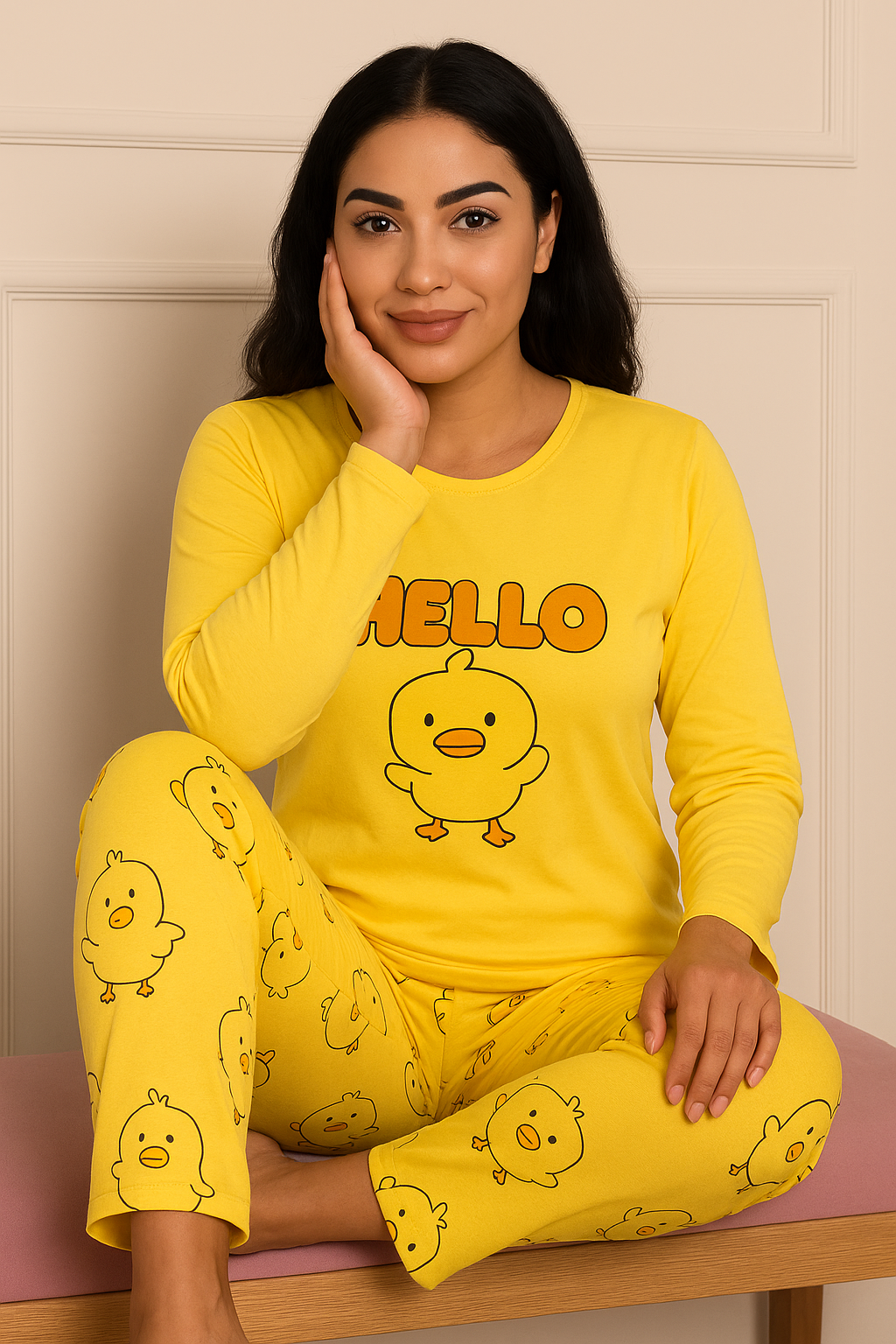 Niketlife Ev Giyim’in enerjik ve modern tasarımı Kadın Ördek Yavrusu Desenli Bisiklet Yaka Uzun Kol Altı Uzun Viskon Pijama Takımı, yumuşak ve nefes alabilen Viskon kumaş yapısıyla gün boyu rahatlık sunar. slogan detayı, bisiklet yaka ve uzun alt tasarımıyla birleşerek hem şık hem de rahat bir uyku ve ev giyimi deneyimi sağlar.