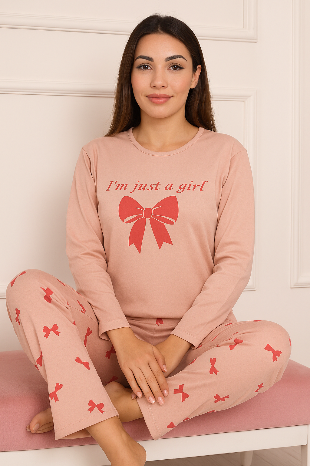 Kadın Sloganlı Kurdele Baskılı Bisiklet Yaka Uzun Kol Altı Uzun Penye Pijama Takımı